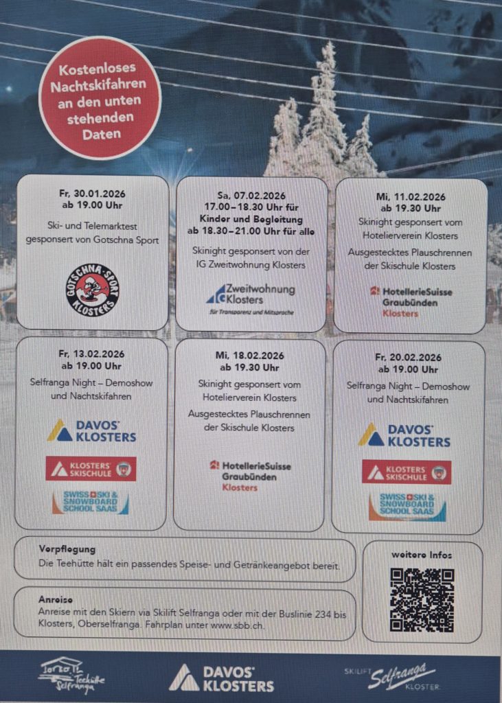 Mi., 11. Februar 2026, ab 19.30 Uh – wegen Schneemangel abgesagt, Skinight by Hotelierverein Klosters und Ausgestecktes Plauschrennen der Skischule Klosters